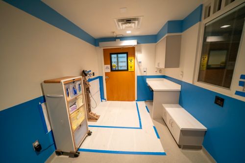 This space is an entry area before the patient/treatment room. It is stocked with special supplies for MIBG therapy. Parents and staff will use this area to get ready to enter the patient room.