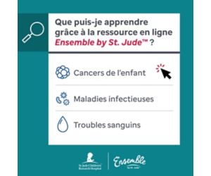 16 septembre 2025La ressource en ligne Ensemble by St. Jude™ comprend désormais des informations portant sur les troubles sanguins, les maladies infectieuses et le cancer de l’enfant. En savoir plus sur l’expansion du site.
